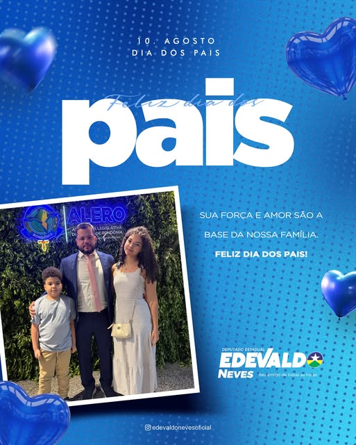 O deputado Edevaldo Neves aproveitou o Dia dos Pais para compartilhar uma mensagem especial, ressaltando a importância e a missão de ser pai. Em suas palavras, ele destacou que “ser pai é assumir uma missão que vai muito além de dar o sobrenome: é ensinar valores, inspirar sonhos e preparar o caminho para que os filhos possam voar”.