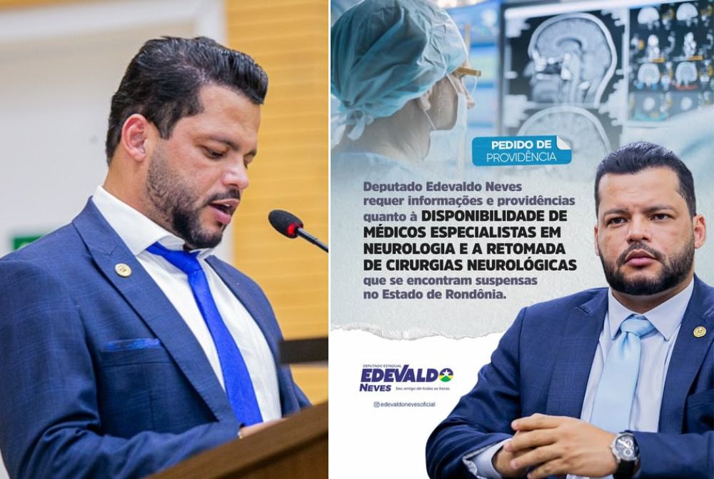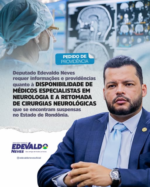 O deputado estadual Edevaldo Neves apresentou um requerimento ao Governo do Estado, à Casa Civil e à SESAU solicitando informações e providências sobre a disponibilidade de médicos especialistas em neurologia e a retomada das cirurgias neurológicas que estão suspensas em Rondônia.