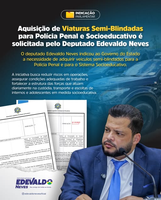 O deputado Edevaldo Neves voltou a chamar atenção para a urgente necessidade de fortalecer a segurança dos servidores da Polícia Penal e do Sistema Socioeducativo de Rondônia. Em indicação apresentada ao Governo do Estado, o parlamentar solicitou a aquisição de viaturas semi-blindadas, medida que considera fundamental para garantir proteção adequada aos profissionais que atuam diariamente em operações de risco.