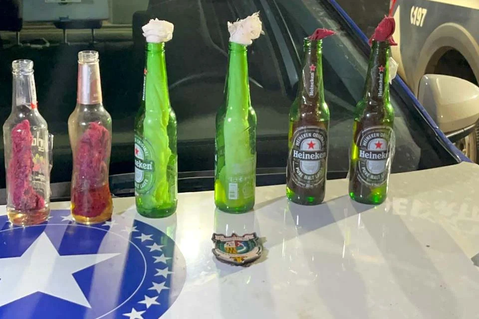 Com eles foram apreendidas várias garrafas com líquido inflamável (coquetéis molotov), e isqueiro que seriam usados para incendiar o estabelecimento comercial.