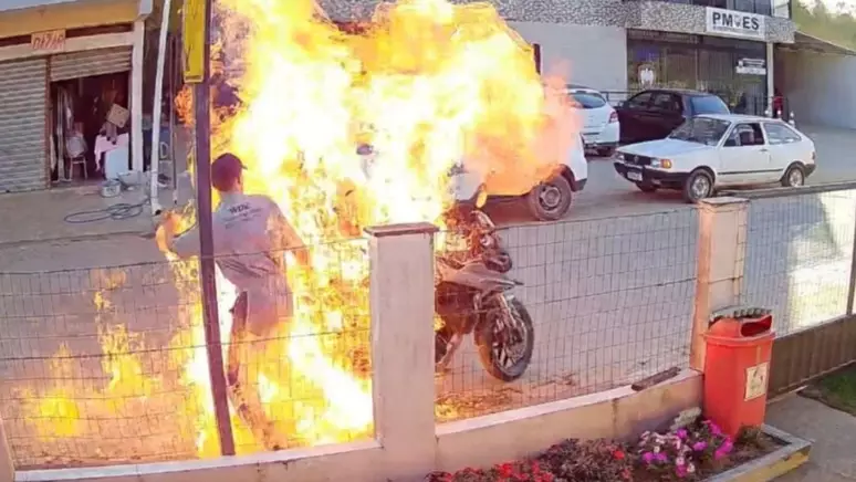 A identidade da mulher não foi divulgada pelas autoridades. Em um vídeo feito por câmera de segurança, policiais aparecem ao lado da motocicleta, que está sem placa, e o homem chega de carro depois. Ele sai do veículo, vai em direção à moto com um galão de combustível e joga o líquido sobre a moto. A mulher aparece em seguida e tenta impedir que ele coloque fogo na moto.