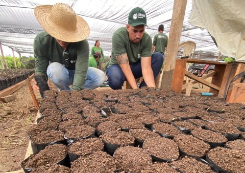 Após a etapa teórica, os servidores estão colocando em prática os conhecimentos adquiridos. Entre as atividades realizadas está o enchimento das sacolas que irão receber as mudas, etapa fundamental para iniciar a produção que, posteriormente, será destinada aos produtores atendidos pelo programa.