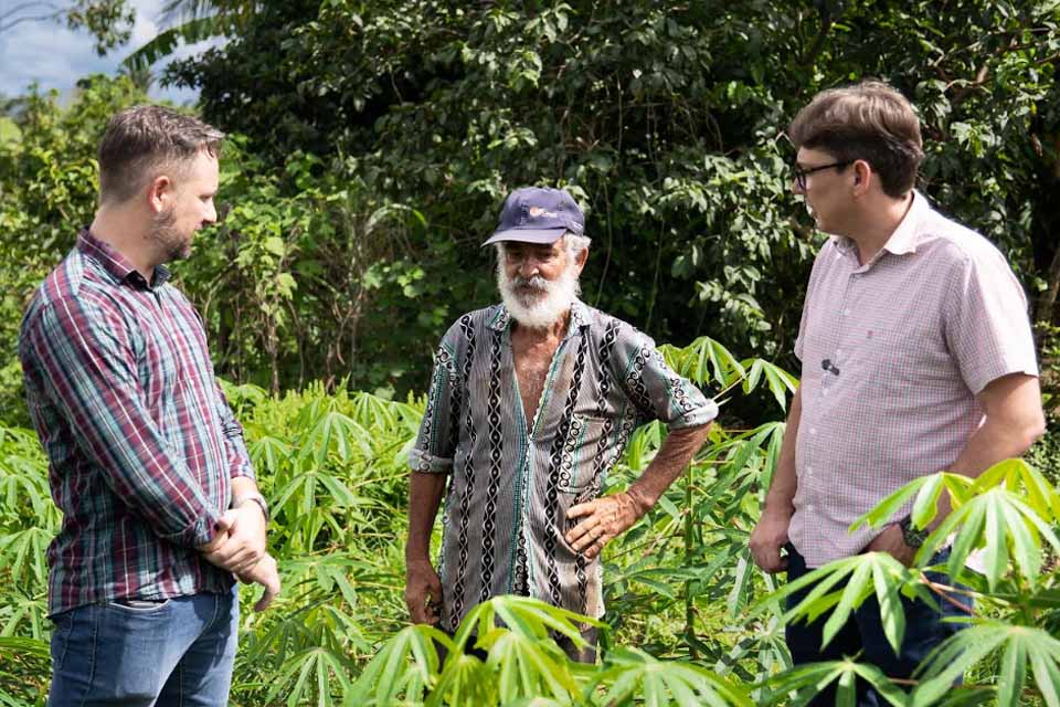 Na última quarta-feira (21), o prefeito Jeverson Lima, o secretário municipal de Meio Ambiente, Cleverson Barbosa, e o secretário executivo de Meio Ambiente, David Cortes Leonel, visitaram a propriedade do produtor rural Ivanildo de Souza Vieira, localizada na Linha 607, para acompanhar o desenvolvimento da lavoura de cacau atendida pelo Programa Campo Produtivo.