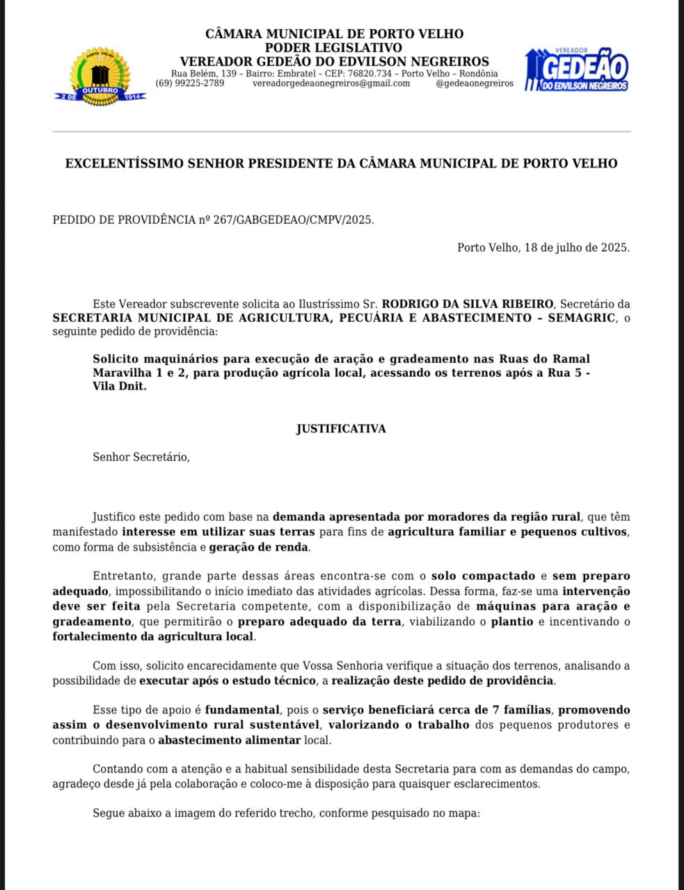 O vereador Gedeão do Edvilson Negreiros (PSDB) protocolou na Câmara Municipal de Porto Velho o Pedido de Providência nº 267/2025, direcionado à Secretaria Municipal de Agricultura, Pecuária e Abastecimento (SEMAGRIC). O documento solicita a disponibilização de maquinários para execução de aração e gradeamento em terrenos localizados no Ramal Maravilha 1 e 2, a partir da Rua 5, na Vila DNIT.